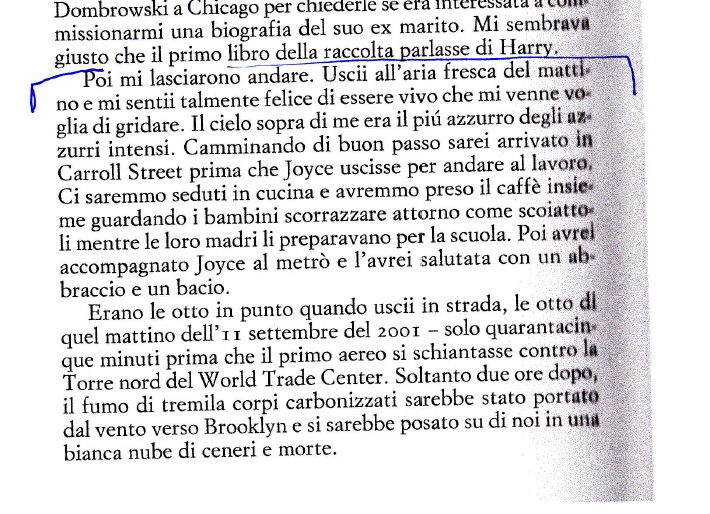 Da Benedetta Manghi riceviamo: “…Soltanto due ore dopo, il fumo di tremila corpi carbonizzati sarebbe stato portato dal vento verso Brooklyn e si sarebbe posato su di noi in una nube bianca di ceneri e morte.”