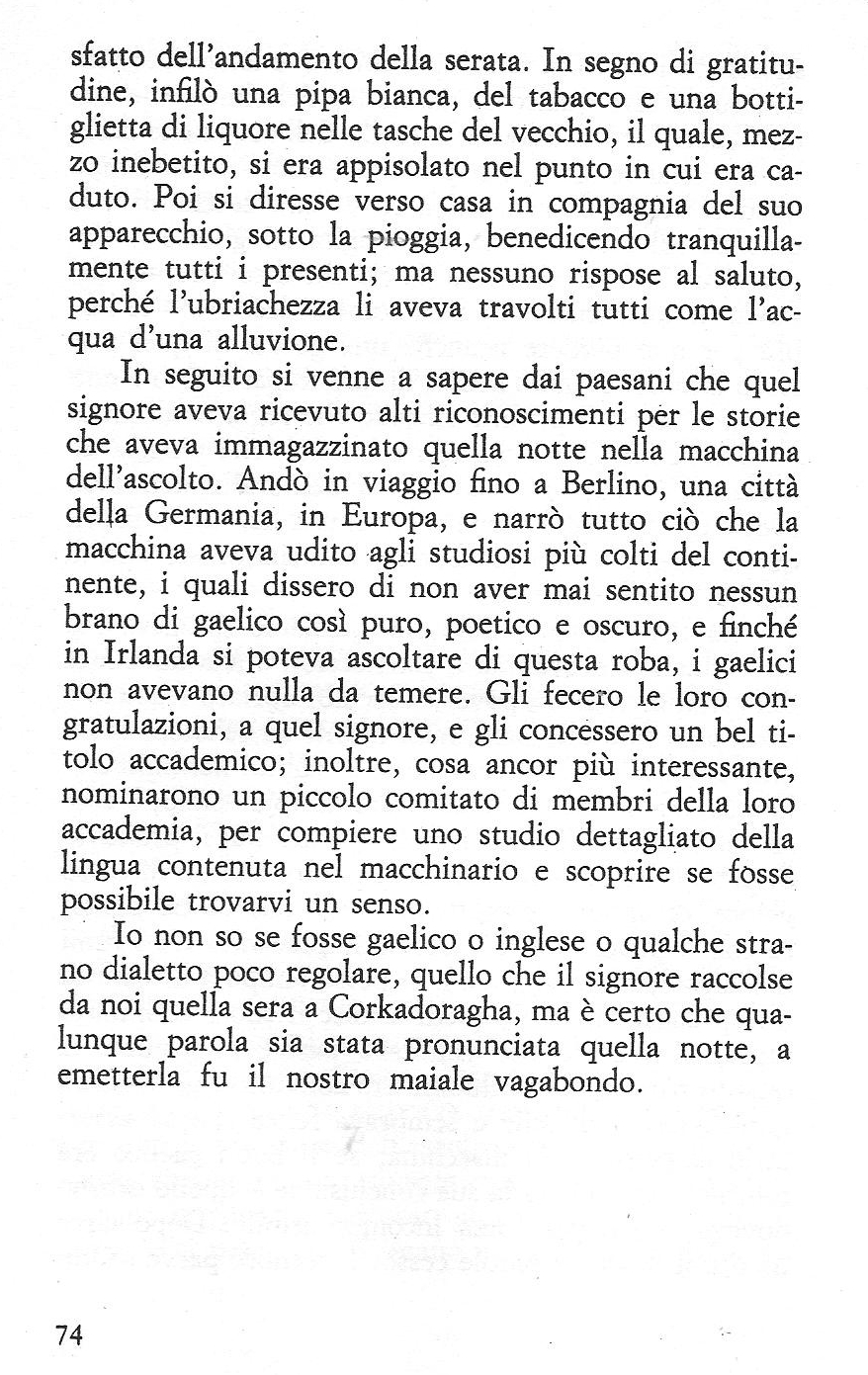 Da un anonimo lettore riceviamo: “….Io non so se fosse gaelico o inglese o qualche stramaledetto dialetto poco regolare, quello che il signore raccolse da noi quella sera a Corkadoragha, ma è certo che qualunque parola sia stata pronunciata quella notte, a emetterla fu il nostro maiale vagabondo. ….”