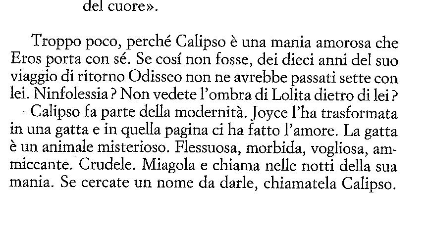 “…La gatta è un animale misterioso. Flessuosa, morbida, vogliosa, ammiccante. Crudele. miagola e chiama nelle notti della sua mania. Se cercate un nome da darle, chiamatela Calipso. …”