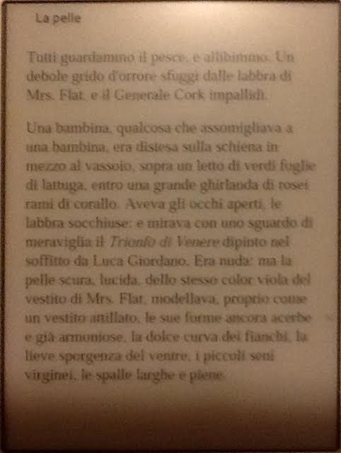 Una bambina, qualcosa che assomigliava a una bambina, era distesa sulla schiena in mezzo al vassoio, sopra un letto di verdi foglie di lattuga, entro una grande ghirlanda di rosei rami di corallo. Aveva gli occhi aperti, le labbra socchiuse: e mirava con uno sguardo di meraviglia il Trionfo di Venere dipinto nel soffitto da Luca Giordano.”