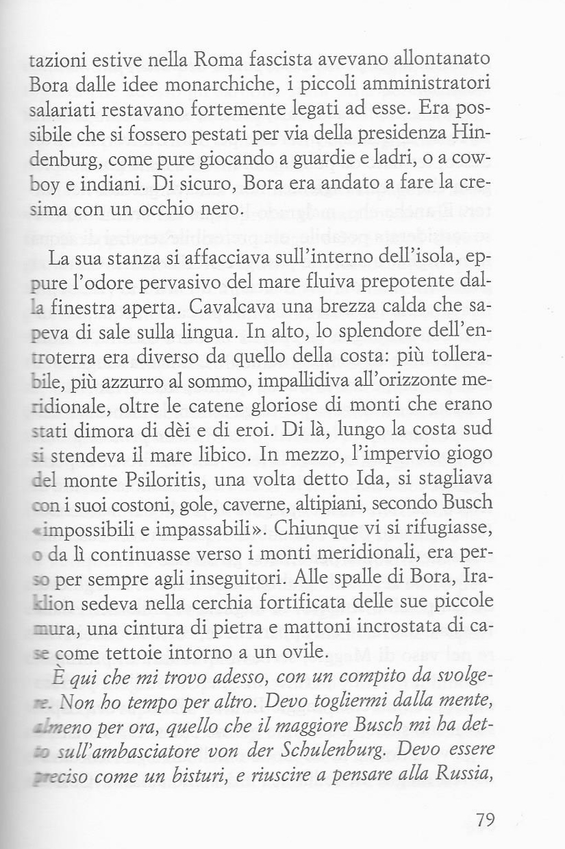 Ben Pastor, si legge nella quarta di copertina, è nata a Roma ed insegna scienze sociali negli Stati Uniti. Ha scritto questa serie di racconti ambientati durante la seconda guerra mondiale. Il protagonista è un giovane tenente dell’esercito tedesco in forza al servizio di intelligence. Qui l’azione è a Creta, appena conquistata dai nazisti, dove Bora, questo è il nome del tenente, deve capire chi ha effettuato una strage di civili inermi. Ho segnalato questo libro per due motivi: il primo sta nella cura della scrittura e delle ricostruzioni storiche. Il secondo è che in questo inverno nevoso aprire una pagina del libro è come aprire una finestra e respirare aria d’estate. Settimane fa un amico mi ha sollecitato una sezione del concorso per libri sui viaggi. Ecco Creta della Ben Pastor è un viaggio e allo stesso tempo un giallo e allo stesso tempo una piccola lezione di storia. Per questo lo segnalo. (eppoi il mio amico Diego Pastorino aveva un parente Beniamino che ben avrebbe potuto quindi chiamarsi Ben Pastor)