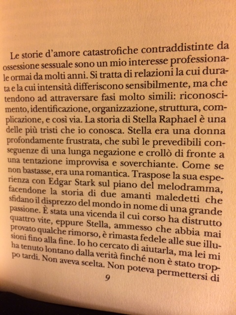 “Le storie d’amore catastrofiche contraddistinte da ossessione sessuale sono un mio interesse professionale ormai da molti anni. Si tratta di relazioni la cui durata e la cui intensità differiscono sensibilmente, ma che tendono ad attraversare fasi molto simili: riconoscimento, identificazione, organizzazione, struttura, complicazione, e così via. …”
