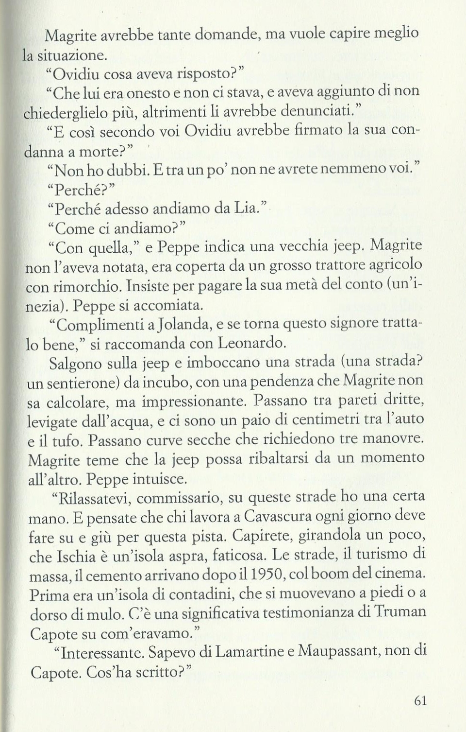 Checché ne dica l’editore questo romanzo qui è tutt’altro che un giallo. Forse può essere definita una delicata storia d’amore tra due ragazzini un po’ agee, ma in realtà è un innamoramento per l’isola di Ischia della quale si offrono, come in una guida di superlusso, spunti storici, geografici e culinari precisi e raffinati. Sempre in questo inverno improvvisamente freddo e puntiglioso leggere delle balze, del mare, degli scogli e della mangiate e bevute del commissario Magrite è davvero una bella vacanza.