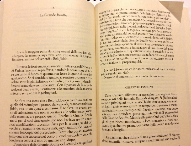 “… Se c’era una scena che a Beit Jiddo non cambiava mai era quella dei raduni per il pranzo del venerdì; erano eterni come Jiddo, vissuto fin quasi a cent’anni. E se c’era un eventi pieno di animazione che non si prestava alle solite esagerazioni della mamma era proprio quello. Perché la Grande Bouffe era di per sé così stravagante che non lasciava spazio a ulteriori amplificazioni. Eccezion fatta per la scomparsa dei più vecchi e l’aggiunta dei nuovi nati, ogni raduno del venerdì era una fotocopia del precedente. Tanto che posso attestare tutto quel che successe nel corso di quel particolare venerdì, benché sia venuta al mondo quattro anni dopo. …”
