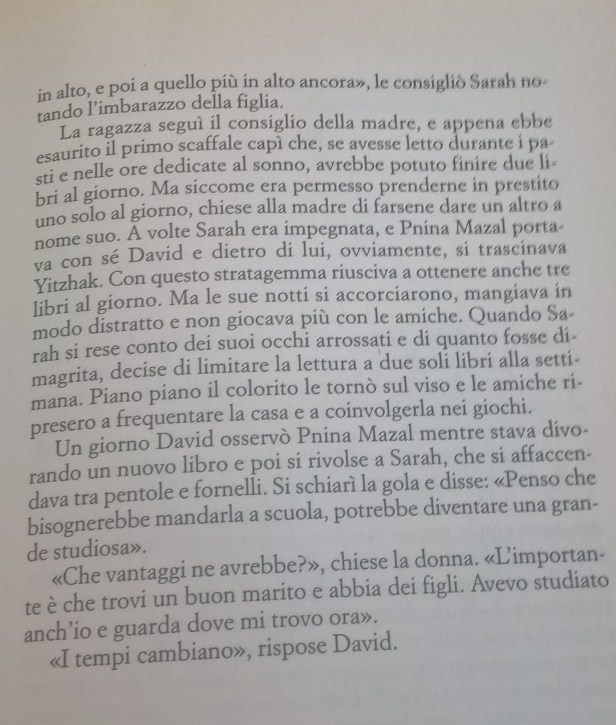 “Un giorno David osservò Pnina Mazal mentre stava divorando un nuovo libro e poi si rivolse a Sarah, che si affancedava tra pentole e fornelli. Si schiarì la gola e disse: