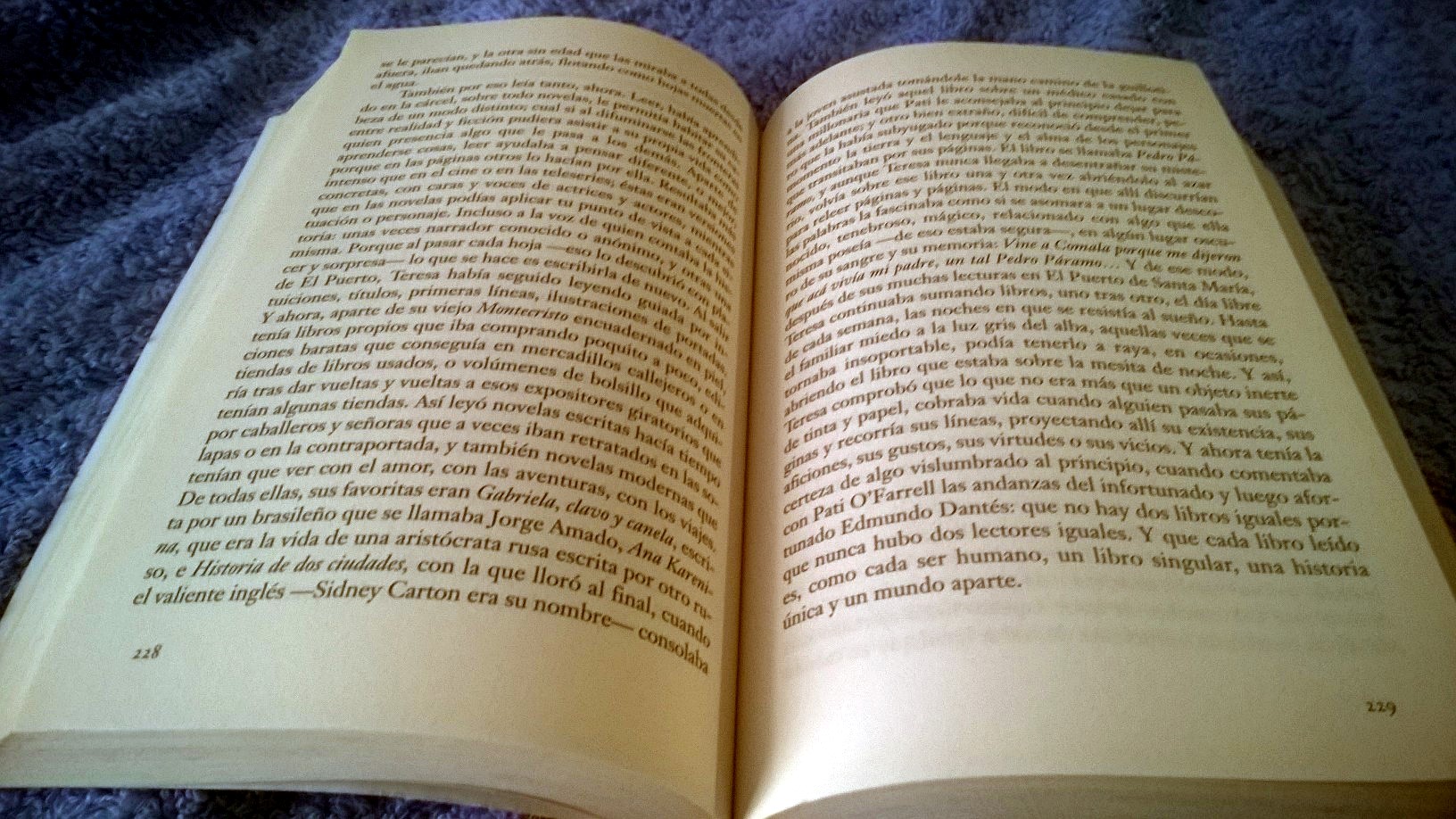 “Teresa si rese conto che quello che non era altro che un oggetto inerte di carta e inchiostro, si riempiva di vita quando qualcuno sfogliava le sue pagine e scorreva le sue righe, proiettando lì la sua esistenza, i suoi drammi, i suoi piaceri, le sue virtù e i suoi vizi. E adesso era certa di quello che aveva intravisto all’inizio, quando commentava con Pati O’Farrell le sorti dello sfortunato, poi fortunato, Edmond Dantes: e cioè che non ci sono due libri uguali perchè non ci sono mai stati due lettori uguali. Perchè ogni libro è, come ogni essere umano, irripetibile, una storia unica e un mondo a sè. “