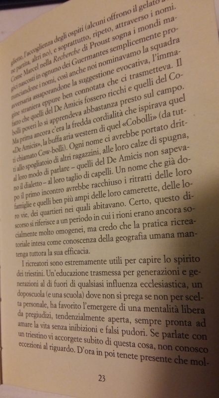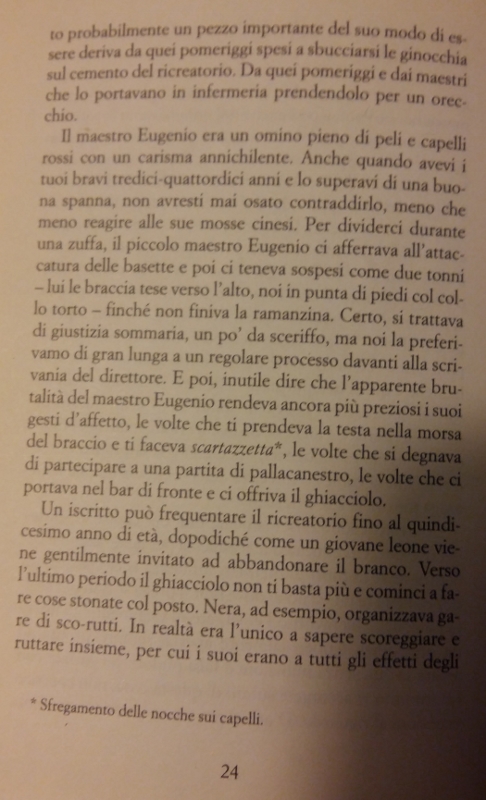 “..Il maestro Eugenio era un omino pieno di peli e capelli rossi con un carisma annichilente. Anche quando avev i tuoi bravi tredici-quattordici anni e lo superavi di una buona spanna, non avresti mai osato contraddirlo, meno che meno reagire alle sue mosse cinesi. Per dividerci durante una zuffa, il piccolo maestro Eugenio ci afferrava all’attaccatura delle basette e poi ci teneva sospesi come due tonni – lui le braccia tese verso l’alto, noi in punta di piedi col collo torto – finché non finiva la ramanzina. …”