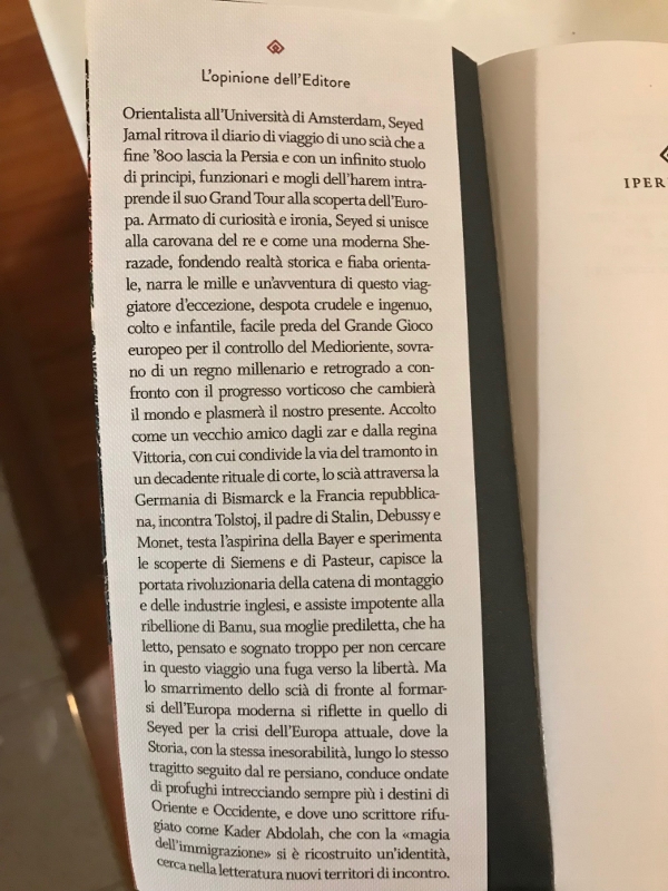 Orientalista all’Università di Amsterdam, Seyed Jamal ritrova il diario di viaggio di uno scià che a fine ’800 lascia la Persia e con un infinito stuolo di principi, funzionari e mogli dell’harem intraprende il suo Grand Tour alla scoperta dell’Europa. Armato di curiosità e ironia, Seyed si unisce alla carovana del re e come una moderna Sherazade, fondendo realtà storica e fiaba orientale, narra le mille e un’avventura di questo viaggiatore d’eccezione, despota crudele e ingenuo, colto e infantile, facile preda del Grande Gioco europeo per il controllo del Medioriente, sovrano di un regno millenario e retrogrado a confronto con il progresso vorticoso che cambierà il mondo e plasmerà il nostro presente. Accolto come un vecchio amico dagli zar e dalla regina Vittoria, con cui condivide la via del tramonto in un decadente rituale di corte, lo scià attraversa la Germania di Bismarck e la Francia repubblicana, incontra Tolstoj, il padre di Stalin, Debussy e Monet, testa l’aspirina della Bayer e sperimenta le scoperte di Siemens e di Pasteur, capisce la portata rivoluzionaria della catena di montaggio e delle industrie inglesi, e assiste impotente alla ribellione di Banu, sua moglie prediletta, che ha letto, pensato e sognato troppo per non cercare in questo viaggio una fuga verso la libertà. Ma lo smarrimento dello scià di fronte al formarsi dell’Europa moderna si riflette in quello di Seyed per la crisi dell’Europa attuale, dove la Storia, con la stessa inesorabilità, lungo lo stesso tragitto seguito dal re persiano, conduce ondate di profughi intrecciando sempre più i destini di Oriente e Occidente, e dove uno scrittore rifugiato come Kader Abdolah, che con la «magia dell’immigrazione» si è ricostruito un’identità, cerca nella letteratura nuovi territori di incontro.