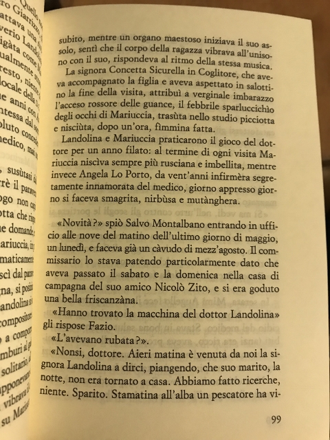 “La signora Concetta Sicurella in Coglitore, che aveva accompagnato la figlia e aveva aspettato in salottino la fine della visita, attribuì a verginale imbarazzo l’acceso rossore delle guance, il febbrile sparluccicchìo degli occhi di Mariuccia, trasùta nello studio picciotta e nisciùta, dopo un’ora, fìmmina fatta.