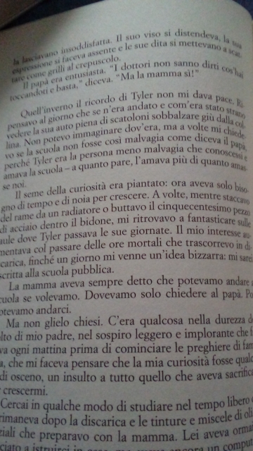 “Il seme della curiosità era piantato: ora aveva solo bisogno di tempo e di noia per crescere. A volte, mentre staccavo del rame da un radiatore o buttavo il cinquecentesimo pezzo di acciaio dentro il bidone, mi ritrovavo a fantasticare sulle aule dive Tyler passava le sue giornata. Il mio interesse aumentava col passare delle ore mortali che trascorrevo in discarica, finché un giorno mi venne un’idea bizzarra: mi sarei iscritta ad una scuola pubblica.”