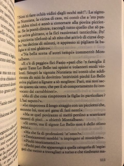 “.. La signura Nunziata, la vicina di casa, mi contò che a ‘sto punto iddra niscì e annò a conortare alla povira picciotta. Se la portò dintra, raccoglì tutto quello che sò patre aviva ghittato, e la fici rassirenari tanticchia. Po’ la picciotta tilefonò al sò zito che arrivò di cursa doppo ‘na decina di minuti, e appresso si pigliaro la baligia e si nni ghiero.”