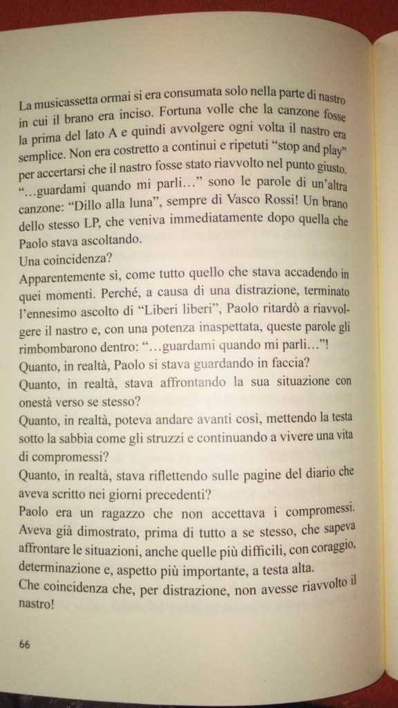 “Una coincidenza? Apparentemente sì, come tutto quello che stava accadendo in quei momenti. Perché, a causa di una distrazione, terminato l’ennesimo ascolto di <<Liberi liberi>>, Paolo ritardò a riavvolgere il nastro e, con una potenza inaspettata, queste parole gli rimbombarono dentro: <<…guardami quando mi parli…>>…”