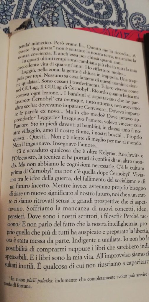 «Questo libro non parla di Černobyl’ in quanto tale, ma del suo mondo. Proprio di ciò che conosciamo meno. O quasi per niente. A interessarmi non era l’avvenimento in sé, vale a dire cosa era successo e per colpa di chi, bensì le impressioni, i sentimenti delle persone che hanno toccato con mano l’ignoto. Il mistero. Černobyl’ è un mistero che dobbiamo ancora risolvere… Questa è la ricostruzione non degli avvenimenti, ma dei sentimenti. Per tre anni ho viaggiato e fatto domande a persone di professioni, destini, generazioni e temperamenti diversi. Credenti e atei. Contadini e intellettuali. Černobyl’ è il principale contenuto del loro mondo. Esso ha avvelenato ogni cosa che hanno dentro, e anche attorno, e non solo l’acqua e la terra. Tutto il loro tempo. Questi uomini e queste donne sono stati i primi a vedere ciò che noi possiamo soltanto supporre… Più di una volta ho avuto l’impressione che in realtà io stessi annotando il futuro».