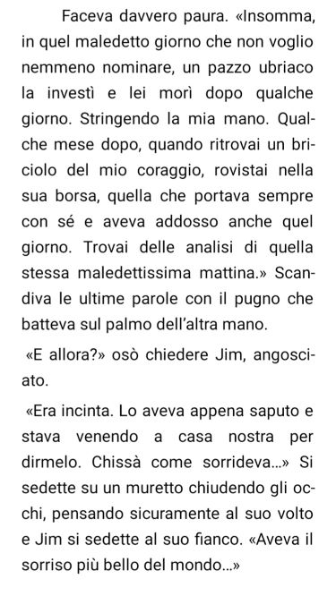 “Faceva davvero paura. <<Insomma, in quel maledetto giorno che non voglio nemmeno nominare, un pazzo ubriaco la investì e lei morì dopo qualche giorno. Stringendo la mia mano. Qualche mese dopo, quando ritrovai un briciolo del mio coraggio, rovistai nella sua borsa, quella che portava sempre con sé e aveva addosso anche quel giorno. Trovai delle analisi di quella stessa maledettissima mattina.>> […]