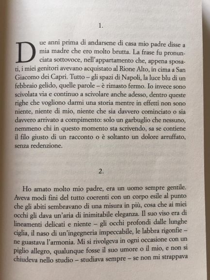 “Due anni prima di andarsene di casa mio padre disse a mia madre che ero molto brutta. La frase fu pronunciata sotto voce, nell’appartamento che, appena sposati, i miei genitori avevano acquistato al Rione Alto, in cima a San Giacomo dei Capri. Tutto – gli spazi di Napoli, la luce blu di un febbraio gelido, quelle parole – è rimasto fermo.”