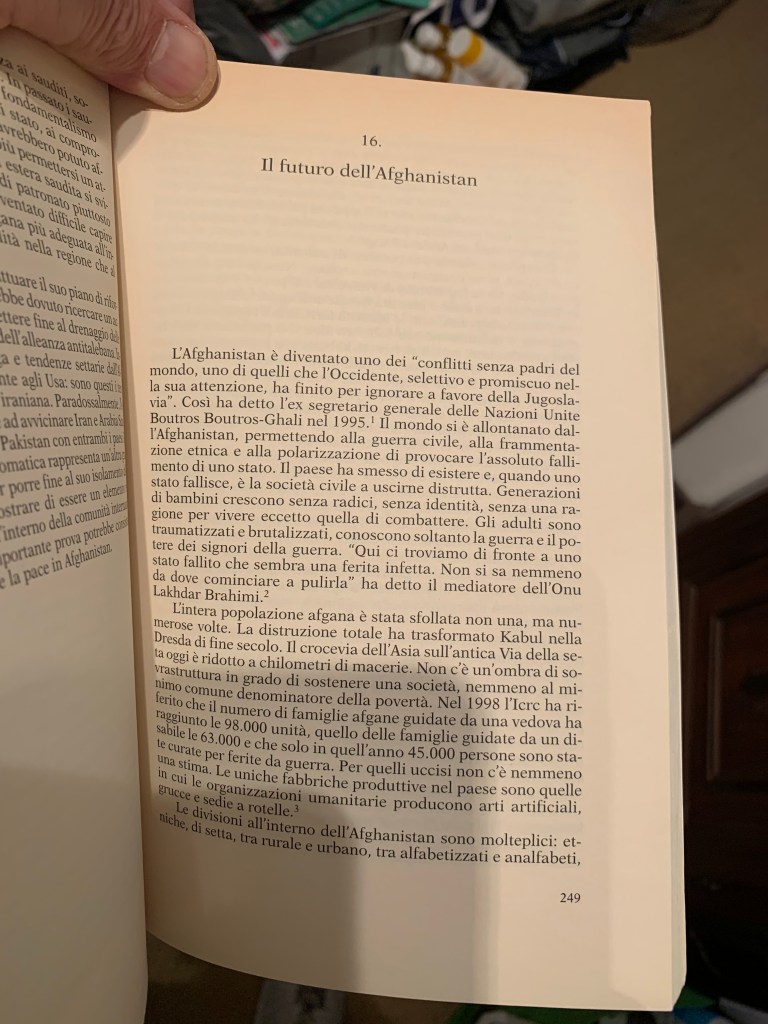 “L’intera popolazione afgana è stata sfollata non una, ma numerose volte. La distruzione totale ha trasformato Kabul nella Dresda di fine secolo. Il crocevia dell’Asia sull’antica Via della seta è oggi ridotto a chilometri di macerie. Non c’è un’ombra di sovrastruttura in grado di sostenere una società nemmeno al minimo denominatore della povertà. Nel 1998 l’Icrc ha riferito che il numero di famiglie afgane guidate da una vedova ha raggiunto le 98.000 unità, quello delle famiglie guidate da un disabile le 63.000 unità e che solo in quell’anno 45.000 persone sono state curate per ferite da guerra. Per quelli uccisi non c’è neppure una stima. Le uniche fabbriche produttive del paese sono quelle in cui le organizzazioni umanitarie producono arti artificiale, grucce e sedie a rotelle.”