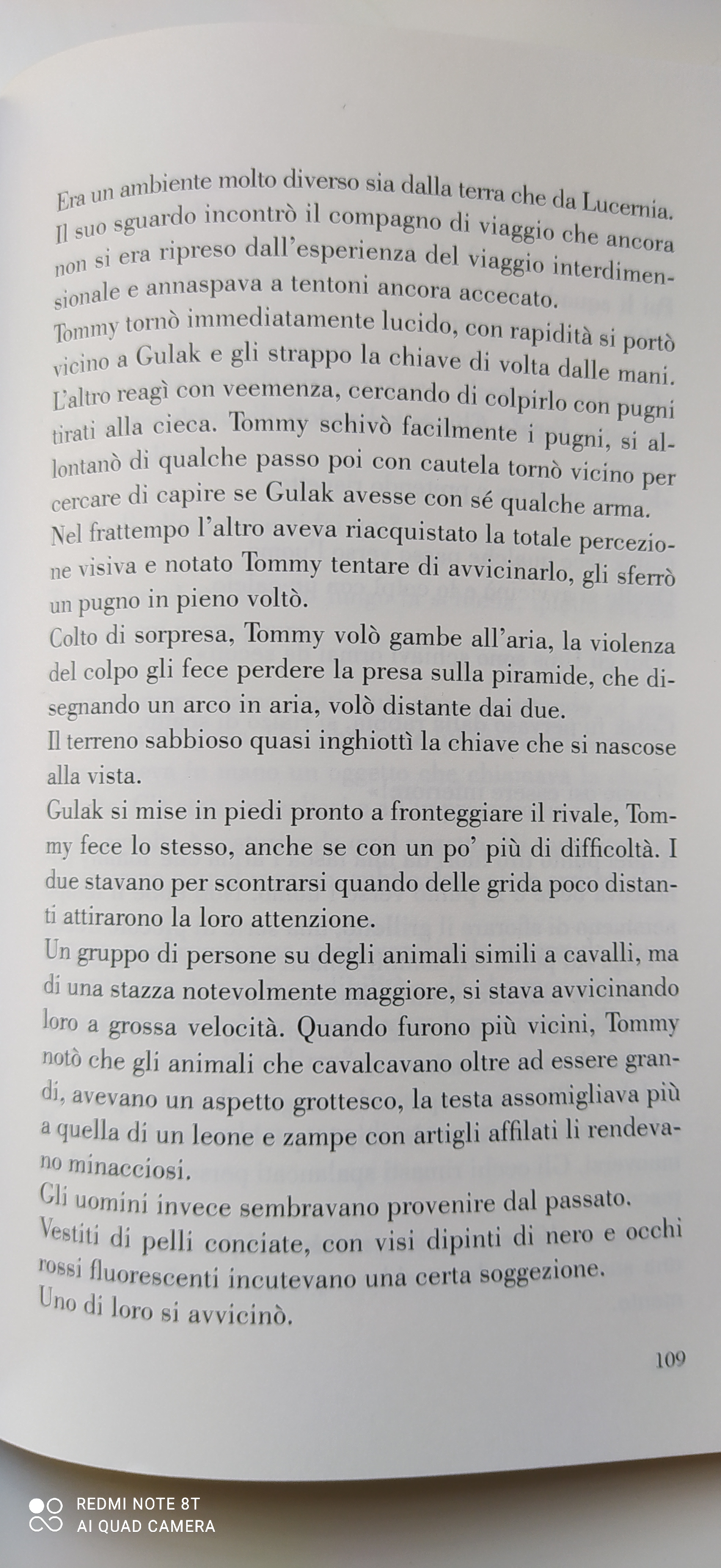 “Un gruppo di persone su degli animali simili a cavalli, ma di una stazza notevolmente maggiore, si stava avvicinando loro a grossa velocità. Quando furono più vicini, Tommy notò che gli animali che cavalcavano oltre ad essere grandi avevano un aspetto grottesco, la testa assomigliava più a quella di un leone e zampe con artigli affilati le rendevano minacciosi.”
