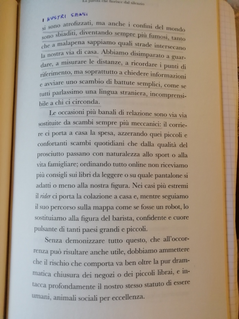 “Abbiamo disimparato a guardare, a misurare le distanze, a ricordare i punti di riferimento, ma soprattutto a chiedere informazioni e avviare uno scambio di battute semplici, come se tutti parlassimo una lingua straniera, incomprensibile a chi ci circonda.”