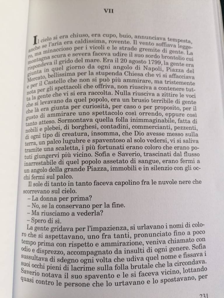 “Era il 20 agosto 1799, la gente era giunta in quel giorno da ogni angolo di Napoli, Piazza del Mercato, bellissima per la stupenda Chiesa che vi si affacciava e per il Castello che non si può più ammirare , ma tristemente nota per gli spettacoli che offriva, non riusciva a contenere tutta la gente che vi si era raccolta. Nulla riusciva a zittire le voci che vi si levavano da quel popolo, era un brusio terribile di gente che là era giunta per curiosità, per caso o per proposito, per il gusto di ammirare uno spettacolo così orrendo, eppure così tanto atteso.”