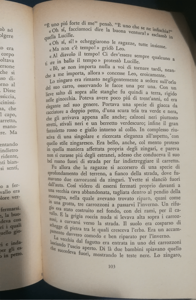 “Era bello, anche, col mento proteso in quella maniera affettata propria degli zingari, e pareva non si curasse più degli estranei, adesso che conduceva il suo bel roano fuori di strada per far indietreggiare il carretto.”