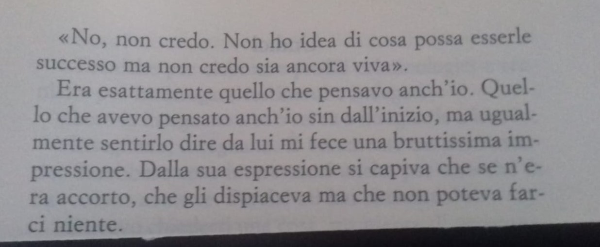 <<No, non credo. Non ho idea di cosa possa esserle successo ma non credo sia ancora viva>>.