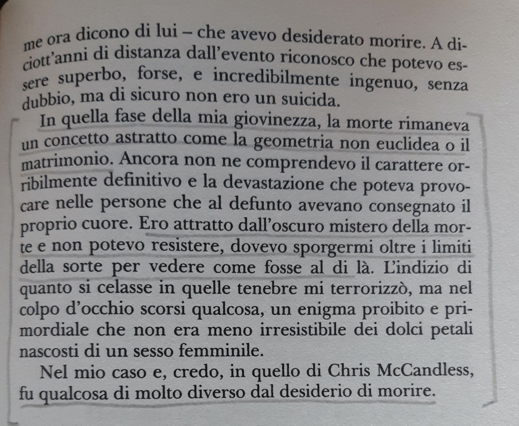 “In quella fase della mia giovinezza, la morte rimaneva un concetto astratto come la geometria non euclidea o il matrimonio. Ancora non ne comprendevo il carattere orribilmente definitivo e la devastazione che poteva provocare nelle persone che al defunto avevano consegnato il proprio cuore. Ero attratto dall’oscuro mistero della morte e non potevo resistere, dovevo sporgermi oltre i limiti della sorte per vedere come fosse al di là.”