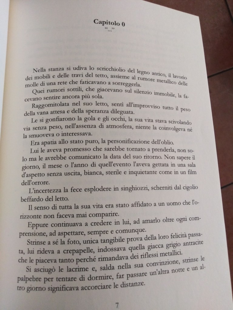 “Nella stanza si udiva lo scricchiolio del legno antico, il lavorio dei mobili e delle travi del tetto, assieme al rumore metallico delle molle di una rete che faticavano a sorreggerla. Quei rumori sottili, che giacevano nel silenzio immobile, la facevano sentire ancora più sola. …”
