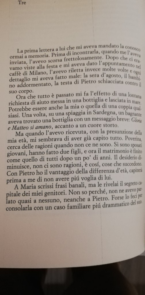 “La prima lettera a lui che mi aveva mandato la conosco ormai a memoria. Prima di incontrarla, quando me l’aveva invitata, l’avevo scorsa frettolosamente. Dopo che ci eravamo viste alla festa e mi aveva dato l’appuntamento nel caffè di Milano, l’avevo riletta invece molte volte e ogni dettaglio mi aveva fatto male: la sera d’agosto, il bambino addormentato, la testa di Pietro schiacciata contro il suo corpo.”