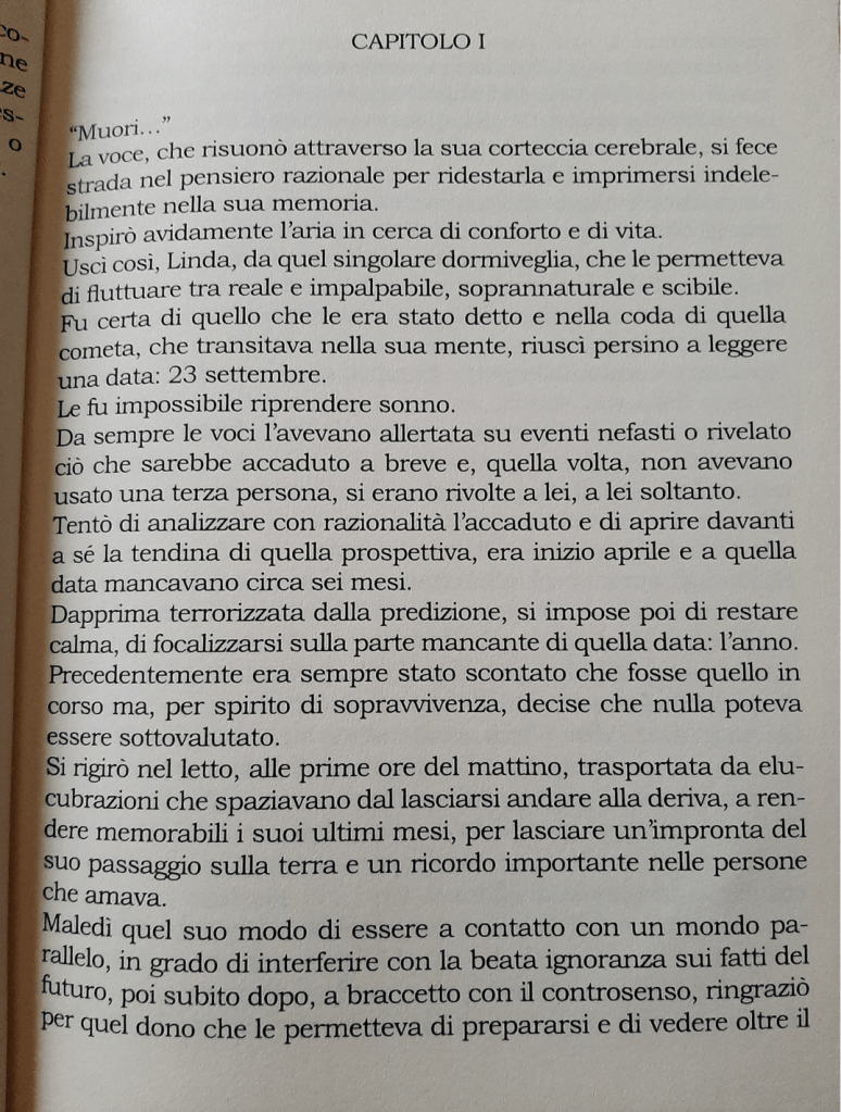Daniela Panzeri scrive: Mando la prima pagina che segna l’inizio di un’avventura attraverso il tempo e le dimensioni che tiene a dir poco incollati al libro. L’ho letto tutto d’un fiato. Inizialmente con un po’ di inquietudine vista la profondità dell’argomento trattato: tocca corde che difficilmente vengono toccate ma questo viaggio nel multi verso vale la pena farlo.