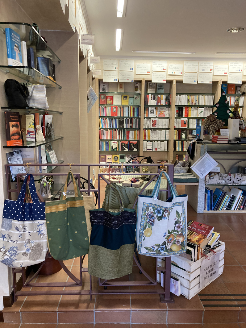 Un altro aspetto personalissimo della libreria sono le bellissime borse per i libri, create dalla bravura di Angela, realizzate con tessuti variopinti, di varie misure, tutte naturalmente pezzi unici!