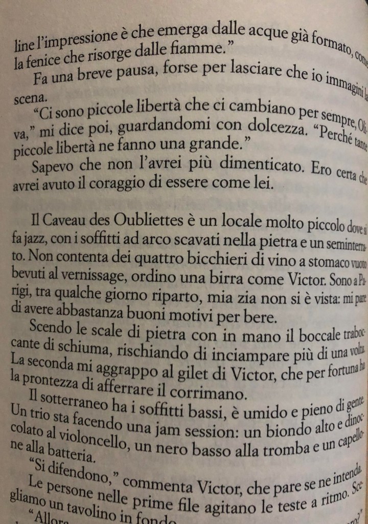 Oliva ha trent’anni, una passione segreta per gli snack orientali e l’abitudine di imitare Rossella O’Hara quando è certa di non essere vista. Di lei gli altri sanno solo che ha un lavoro precario, abita con i genitori e sta per sposare Bernardo, il sogno di ogni madre. Nessuno immagina che soffra di insonnia e di tachicardia, e che a volte senta dentro un vuoto incolmabile. Fa parte della vita, le assicura la psicologa, e d’altronde la vita è come il mare: basta imparare a tenersi in equilibrio sulla tavola da surf. Ma ecco arrivare l’onda anomala che rischia di travolgerla. Dopo anni di silenzio, la carismatica ed eccentrica zia Vivienne – che le ha trasmesso l’amore per il teatro e la pâtisserie – le invia un biglietto per Parigi, dove la aspetta per questioni urgenti. Oliva decide di partire senza immaginare che Vivienne non si presenterà all’appuntamento e che mettersi sulle sue tracce significherà essere accolta dalla sgangherata comunità bohémienne che fa base in una delle più famose librerie parigine, Shakespeare and Company. Unica regola: aiutare un po’ tra gli scaffali e leggere un libro al giorno. Mentre la zia continua a negarsi, Oliva capisce che può esserci un modo di stare al mondo molto diverso da quello a cui è abituata, più complicato ma anche più semplice, dove è possibile inseguire un sogno o un fenicottero, o bere vino sulla Senna con un clochard filosofo. Dove si abbraccia la vita invece di tenersene a distanza, anche quando fa male. E allora, continuare a cercare l’inafferrabile Vivienne o cedere al proprio senso del dovere e tornare a casa? E soprattutto: restare fedele a ciò che gli altri si aspettano da lei o a se stessa? Quando tante piccole libertà finiscono per farne una grande, rinunciarci diventa quasi impossibile.