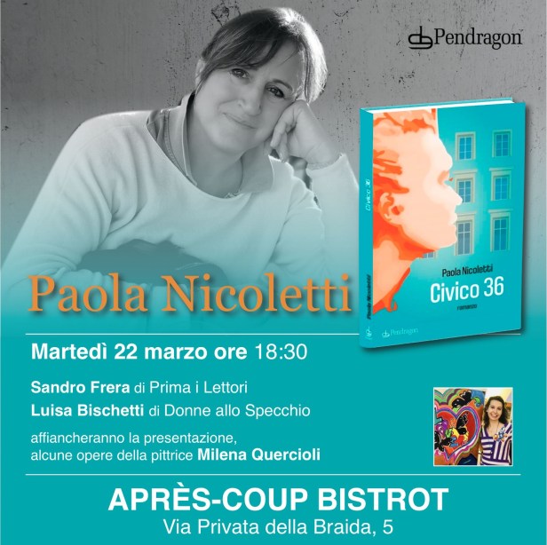 Detto questo, un nuovo importante annuncio. Il 22 marzo alle 18.30 presso il Apres-Coup Bistrot Sandro Frera per Prima i Lettori e la signora Luisa Bischetti per Donne allo specchio presenteranno il nuovo libro della scrittrice e commediografa Paola Nicoletti dal titolo Civico 36 (Pedragon editrice). Affiancheranno la presentazione alcune opere della pittrice Milena Quercioli. Il Apres-Coup Bistrot si trova in via privata della Braida 5 Milano (tram nr 16 oppure M3). Vi aspettiamo.