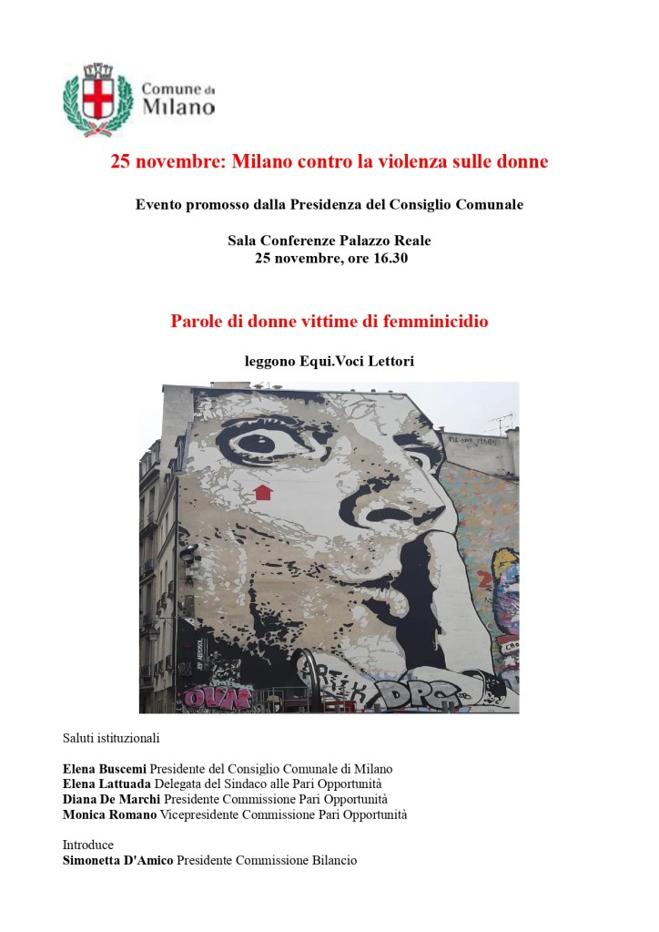 E’ stato promosso dalla Presidenza del consiglio comunale e prevede interventi e saluti istituzionali, quindi un programma di letture di Equi.Voci Lettori (10 voci femminili e una maschile) che leggeranno da FERITE A MORTE di Serena Dandini.