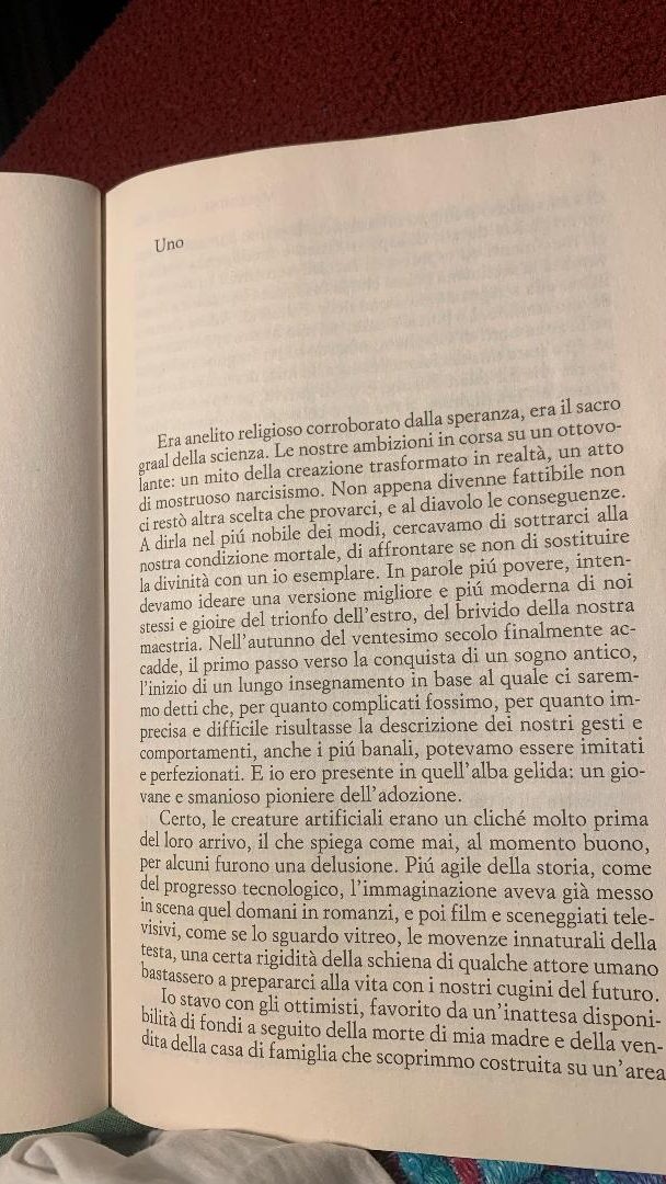 Londra, un altro 1982. Nelle isole Falkland infuriano gli ultimi fuochi della guerra contro l’Argentina, ma per le vie della città non sventoleranno le bandiere della vittoria. I Beatles si sono da poco ricostituiti e la voce aspra di John Lennon continua a diffondersi via radio. Anche il meritorio decrittatore del codice Enigma, Alan Turing, è scampato alla morte precoce, e i suoi studi hanno reso possibili alcune delle conquiste tecnologiche di questi «altri» anni Ottanta, dalle automobili autonome ai primi esseri umani artificiali. Fra chi non resiste alla tentazione di aggiudicarsi uno dei venticinque prototipi esistenti nel mondo, dodici Adam e tredici Eve, c’è Charlie Friend. Certo, un grosso investimento per un trentaduenne che si guadagna da vivere comprando e vendendo titoli online. Ma Charlie è convinto che quel suo Adam bellissimo, forte, capace in tutto, «articolo da compagnia, sparring partner intellettuale, amico e factotum» secondo le promesse dei costruttori, gli sarà di grosso aiuto con l’affascinante ma sfuggente Miranda, la giovane vicina del piano di sopra. Per certi versi non ha torto. Il primo non-uomo ha accesso a tutto quello che si può sapere, dalla soluzione del problema matematico P e NP, all’influenza di Montaigne su Shakespeare, fino al modo di vincere le resistenze di Miranda e penetrarne il segreto. Un segreto complicato e doloroso che, quando emerge, pone ciascuno di fronte a un dilemma etico lacerante. Ma la legge piú inviolabile dell’androide recita: «Un robot non può recar danno a un essere umano né può permettere che, a causa del proprio mancato intervento, un essere umano riceva danno». E per un’intelligenza artificiale tanto sofisticata da anteporre la coscienza alla scienza, il concetto di danno può essere piú profondo e micidiale di quel che appare.