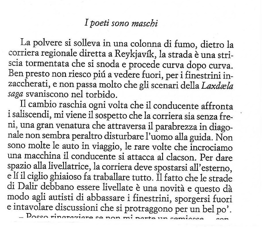 “La polvere si solleva in una colonna di fumo, dietro la corriera regionale diretta a Reykjavìk, la strada è una striscia tormentata che si snoda e procede curva dopo curva.”