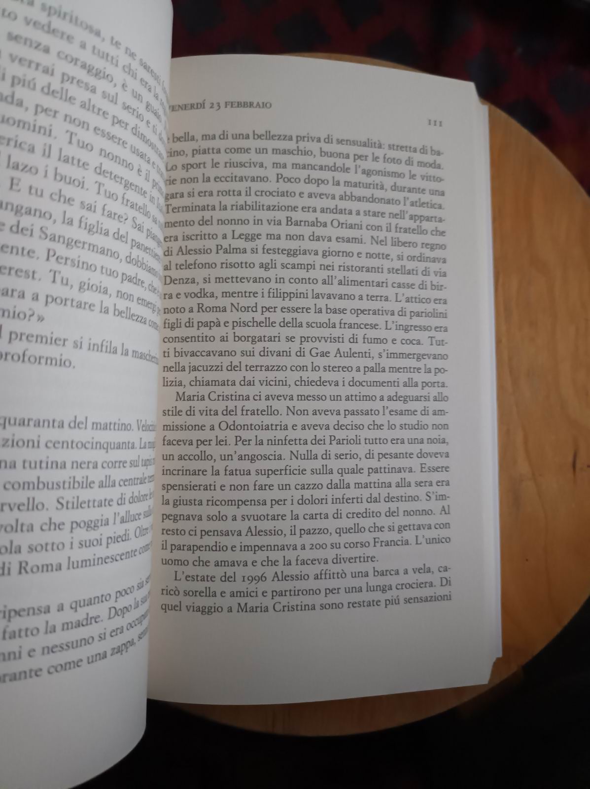 “Poco dopo la maturità, durante una gara si era rotta il crociato e aveva abbandonato l’atletica. Terminata la riabilitazione era a andata a stare nell’appartamento del nonni in via Barnaba Oriani con il fratello che era iscritto a Legge ma non dava esami. Nel libero rigno di Alessio Palma si festeggiava giorno e notte, si ordinava al telefono risotto agli scampi nei ristoranti stellati di via Denza, si mettevano in conto all’alimentari casse di birra e vodka, mentre i filippini lavavano a terra. L’attico era noto a Roma Nord per essere la base operativa di pariolini figli di papà e pischelle della scuola francese. L’ingresso era consentito ai borgatari se provvisti di fumo e coca. Tutti bivaccavano sui divani di Gae Aulenti, si immergevano nella jacuzzi del terrazzo con la stereo a palla mentre la polizia, chiamata dai vicini, chiedeva i documenti alla porta.”