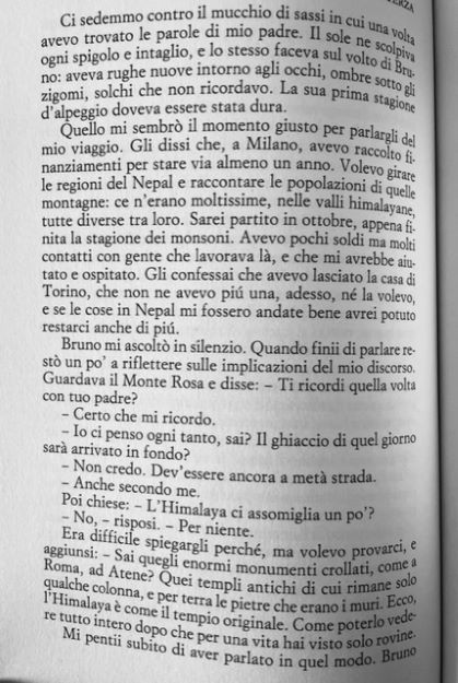 Iniziano cosí estati di esplorazioni e scoperte, tra le case abbandonate, il mulino e i sentieri piú aspri. Sono anche gli anni in cui Pietro inizia a camminare con suo padre, «la cosa piú simile a un’educazione che abbia ricevuto da lui». Perché la montagna è un sapere, un vero e proprio modo di respirare, e sarà il suo lascito piú vero: «Eccola lí, la mia eredità: una parete di roccia, neve, un mucchio di sassi squadrati, un pino». Un’eredità che dopo tanti anni lo riavvicinerà a Bruno.
