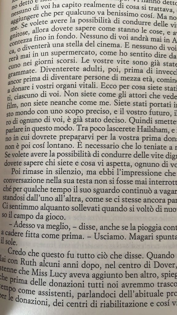 Kathy, Tommy e Ruth vivono in un collegio, Hailsham, immerso nella campagna inglese. Non hanno genitori, ma non sono neppure orfani, e crescono insieme ai compagni, accuditi da un gruppo di tutori, che si occupano della loro educazione. Fin dalla piú tenera età nasce fra i tre bambini una grande amicizia. La loro vita, voluta e programmata da un’autorità superiore nascosta, sarà accompagnata dalla musica dei sentimenti, dall’intimità piú calda al distacco piú violento. Una delle responsabili del collegio, che i bambini chiamano semplicemente Madame, si comporta in modo strano con i piccoli. Anche gli altri tutori hanno talvolta reazioni eccessive quando i bambini pongono domande apparentemente semplici. Cosa ne sarà di loro in futuro? Che cosa significano le parole «donatore» e «assistente»? E perché i loro disegni e le loro poesie, raccolti da Madame in un luogo misterioso, sono cosí importanti?