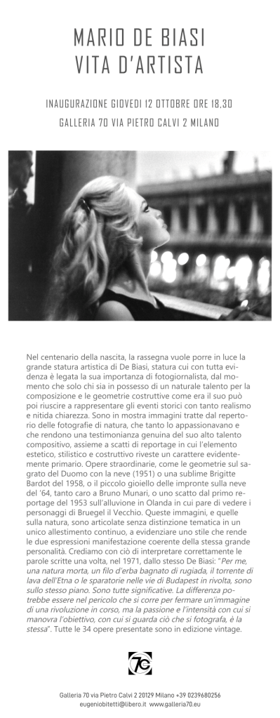 Inaugurazione giovedì 12 ottobre alle ore 18.30 presso la Galleria 70 in via Pietro Calvi 2 a Milano.