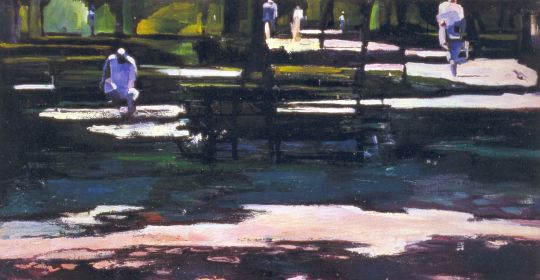 L’esposizione milanese raccoglie quattordici dipinti ad olio su tela di formato orizzontale. In questa nuova, inedita e fluttuante serie di dipinti, permangono gli azzurri – ora più tenui – ma sono i verdi i veri protagonisti di uno sguardo sulla città che in Giovannoni si rinnova costantemente.