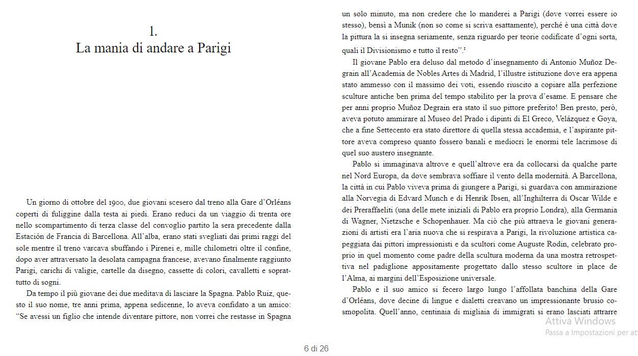 Ottobre 1900. Dopo un estenuante viaggio di trenta ore, due giovani artisti arrivano alla Gare d’Orléans, carichi di bagagli e attrezzi del mestiere, ma soprattutto di sogni. Si chiamano Pablo Picasso e Carlos Casagemas. Fuori li aspetta, immensa ed elettrizzante, Parigi, il luogo in cui – dopo la rivoluzione degli Impressionisti e di straordinari scultori come Auguste Rodin – ogni artista vuole essere. È la città degli infiniti cantieri e dell’Esposizione Universale, delle invenzioni mirabolanti e delle folle febbrili. Ovunque rimbomba il brulicare minaccioso ed eccitante della grande metropoli, con le sue luci, i teatri e i locali notturni, ma anche con le sue librerie e le nuove gallerie d’arte.