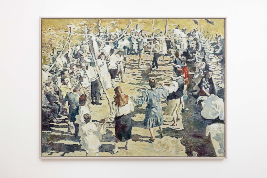 La serie Dancers and Mourners si basa su vari fotogrammi tratti da fonti diverse: video di matrimoni e rituali celebrativi in Albania, film d’autore e fotogrammi tratti da vari documentari. La costante presenza umana, momenti di vita quotidiana e corpi che sfumano in presenze spettrali sono alcuni degli elementi ricorrenti rappresentati con gesti vibranti nell’opera di Paci. Sono soggetti che appartengono a un teatro esistenziale, tanto organizzato quanto anarchico, in cui la natura familiare della tradizione si fonde con un senso erratico di imprevedibilità. Dalle pennellate di Paci si materializza un che di solenne, una sensazione di risveglio indotta da memorie e riferimenti culturali antichi, infusi ora di nuova vita sulle tele dell’artista.