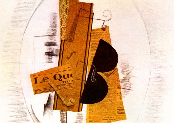 Il quotidiano, infatti, è reale ed è incollato sulla tela, la pipa è ritagliata da una illustrazione e dunque non è una pipa, è la forma di una pipa (e qui si capisce Magritte) il violino non è un violino, è la forma di un violino ritagliata in un cartone e dipinta, è la forma di un oggetto, non è reale. Il tavolino è visto dall’alto, mentre gli oggetti sono frontali, ritagli in finto legno e l’ovale disegnato ci fanno capire che è un tavolino-non-tavolino, nonché la cornice delle immagini.