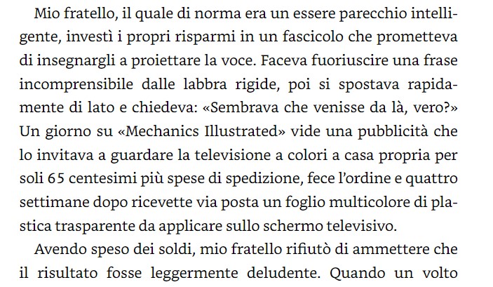 A questo proposito Roberto ci scrive: “Si ride dall’inizio alla fine di questa storia dello sviluppo industriale dell’America, dopo la seconda guerra mondiale, raccontata da Bill Bryson, un bambino di Des Moines, nelle grandi pianure del Midwest. Una storia di un’America felice, innocente ed inconsapevole. È un luogo privilegiato per descrivere con raffinato umorismo una nazione che è diventata più ricca e potente, dopo la seconda guerra mondiale. Il piccolo Bill e’ trascinato nelle ossessioni dei comunisti e della bomba atomica, delle luccicanti lavatrici e della televisione. Un mondo dove si coltivano sogni e li si vivono come nei film di fantascienza così cari al piccolo Bill Bryson. Ora autore affermato e giornalista del the New Yorker.“