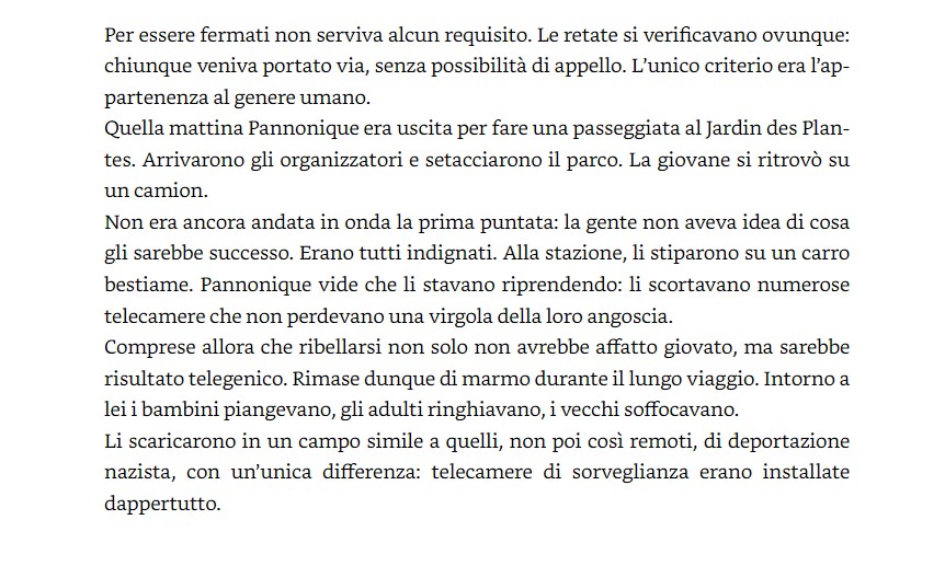 Un reality show dall’inequivocabile nome Concentramento, basato su regole che ricordano il momento più orribile della storia dell’umanità. Per le strade di Parigi si aggira una troupe televisiva inviata a reclutare i concorrenti, che vengono caricati su vagoni piombati e internati in un campo dove altri interpretano il ruolo di kapò. La vita di tutti si svolge sotto l’occhio vigile delle telecamere e il momento di massima audience arriva quando i telespettatori decidono l’eliminazione-esecuzione dallo show di un concorrente attraverso il televoto. Gli strali della scrittrice da sempre al centro di polemiche colpiscono questa volta, con meno leggerezza ironica e più disgusto, una società in cui la sofferenza diventa spettacolo.