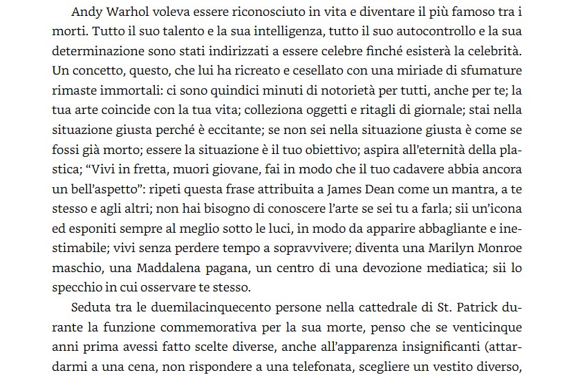 Stefano ci scrive: “Ieri sera, finito “La paura del portiere di fronte al cacio di rigore” (Handke), rimiravo sconsolato le pile di libri da leggere, senza decidere cosa scegliere, con una specie di riffa, ho pescato “Factory Girl” di Nadia Busato. Premesso che ho dovuto spesso ricorrere al dizionario, il linguaggio è ricercatissimo, non riesco più a staccarmi. È un libro stupendo, geniale e perfetta la lettura di Warhol (una vecchia passione, ho numerosi suoi film, quasi tutti inguardabili) molto originale e giusta la analisi del ruolo delle ragazze Superstar, senza di loro la Factory sarebbe stata solo una Dark Room Gay stradrogata (anche se era parzialmente rivestita di metallo sbarluccicante) con loro è diventata: La Factory. Molto intelligente la idea di far raccontare la storia da Ultra Violet, rosa dai sensi di colpa per il suicidio di Edie Sedgwick, il completamento alchemico dell’Androgino, la metà di Warhol. Grande scrittrice. Consiglio senza se e senza ma.”