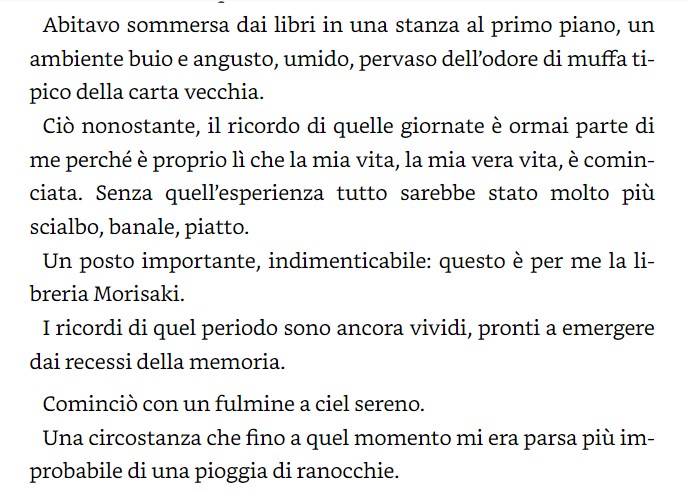Jinbōchō, Tokyo. Il quartiere delle librerie e delle case editrici, paradiso dei lettori. Un angolo tranquillo e fuori dal tempo, a pochi passi dalla metropolitana e dai grandi palazzi moderni. File e file di vetrine stipate all’inverosimile di libri, nuovi o di seconda mano. Non tutti lo conoscono, più attratti da Ginza o dalle mille luci di Shibuya. Di sicuro Tatako – venticinquenne dalla vita piuttosto incolore – non lo frequenta assiduamente. Eppure è qui che si trova la libreria Morisaki, che appartiene alla sua famiglia da tre generazioni. Un negozio di appena otto tatami in un vecchio edificio di legno, con una stanza al piano superiore adibita a magazzino. È il regno di Satoru, l’eccentrico zio di Tatako. Entusiasta e un po’ squinternato, dedica la sua vita ai libri e alla Morisaki, soprattutto da quando la moglie lo ha lasciato. L’opposto di Tatako, che non esce di casa da quando l’uomo di cui era innamorata le ha detto di voler sposare un’altra. È Satoru a lanciarle un’ancora di salvezza, offrendole di trasferirsi al primo piano della libreria. Proprio lei che non è certo una forte lettrice, si trova di colpo a vivere in mezzo a torri pericolanti di libri e minacciosi clienti che continuano a farle domande e a citarle scrittori ignoti. Tra discussioni sempre più appassionate sulla letteratura moderna giapponese, un incontro in un caffè con un timido sconosciuto e rivelazioni sulla storia d’amore di Satoru, scoprirà pian piano un modo di comunicare e di relazionarsi che parte dai libri per arrivare al cuore. Un modo di vivere più intimo e autentico, senza paura del confronto e di lasciarsi andare.