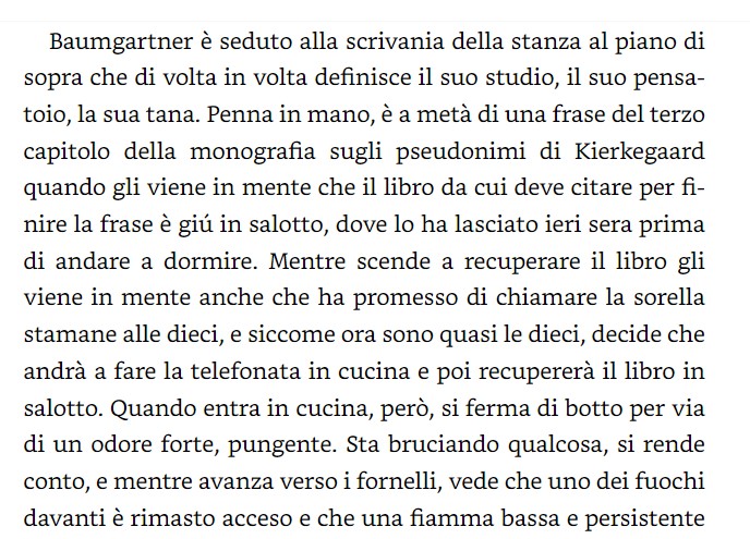 Buona parte della narrazione si perde nei ricordi: “Sarebbe il caso di indagare come alcuni momenti fugaci e imprevedibili restano impressi nella memoria, e invece altri, in teoria più importanti, svaniscono per sempre” si chiede mentre sonnecchia sulla sdraio in giardino in una splendida giornata di settembre; oppure dopo un sogno che vive come reale, dove da un telefono che non funziona più sente la voce della moglie morta ormai da dieci anni dirgli “Il vivo può mantenere il morto in una specie di limbo provvisorio tra la vita e la non-vita, ma quando muore anche il vivo, allora è la fine, e la coscienza del morto si spegne per sempre”.