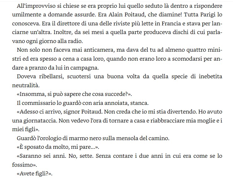 «Quanti mesi, quanti anni ci vogliono perché un bambino diventi un ragazzo, e un ragazzo un uomo?». Ad Alain Poitaud, direttore appena trentaduenne di un settimanale di enorme successo, bastano poche ore per smettere di essere l’uomo che è stato e «diventare un altro». Accade in una piovosa sera di ottobre, allorché, tornando a casa per cambiarsi in vista di una cena in compagnia della moglie Jacqueline e della piccola corte di cui è solito circondarsi, trova ad aspettarlo davanti al portone un ispettore della Polizia giudiziaria. Poco dopo, al Quai des Orfèvres, si sentirà dire che Jacqueline ha ucciso la sorella minore, Adrienne, con un colpo di pistola, chiudendosi poi in un mutismo assoluto. La stampa ci metterà poco a scoprire che con Adrienne, per parecchi anni, Alain è andato a letto regolarmente, e parlerà di «dramma della gelosia», ma lui – l’uomo cinico, superficiale, mondano, il donnaiolo incallito sempre pronto a fare dell’ironia – comincerà a chiedersi quale sia stato il vero motivo di quel gesto. E mentre la polizia conduce la sua indagine, si interrogherà su quella giovane donna accondiscendente e discreta (tanto che fin dall’inizio l’ha chiamata Micetta), che ha sposato quasi per gioco, che gli è sempre stata accanto senza chiedere niente – ma, soprattutto, in un crescendo di smarrimento e di angoscia, si interrogherà su se stesso.
