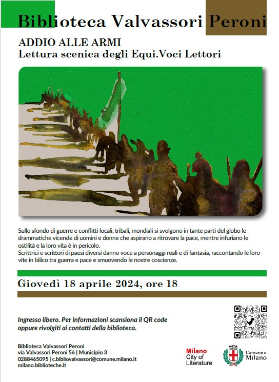 Dal titolo a un brevissimo brano del romanzo di Hemingway, prende avvio la lettura che comprende una selezione di brani di letteratura sul tema, intervallati da versi di poesie con l’accento sull’aspirazione alla pace delle persone, donne, uomini, amici e nemici che, coinvolti nelle guerre, esprimono, attraverso le voci di scrittrici e scrittori, sofferenza e speranze. In chiusura una poesia dell’artista, poeta Antje Stehn recitata da lei. Vi aspettiamo!